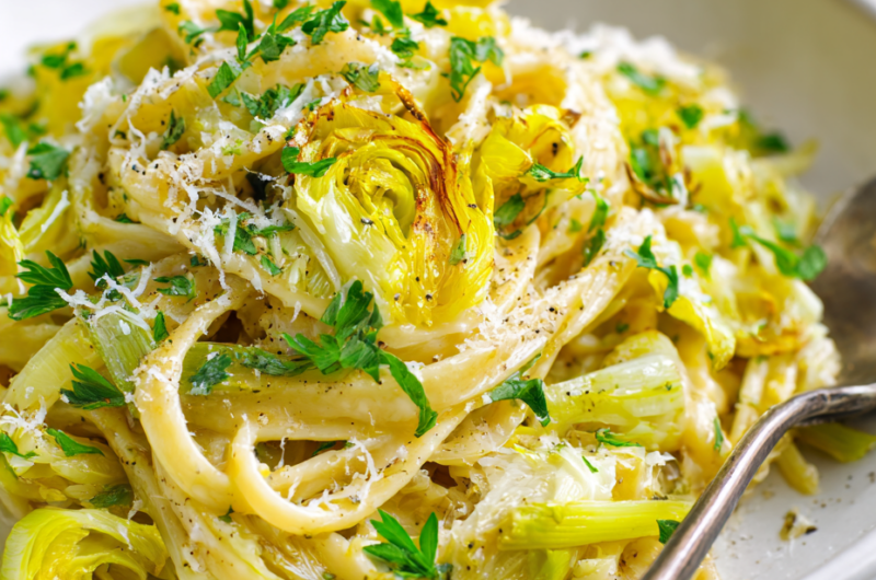 - Remove from heat and let the pasta rest for a couple of minutes. Serve hot, garnished with extra cheese or herbs if desired, and enjoy the rich, silky textures of this slow-cooked leek pasta.