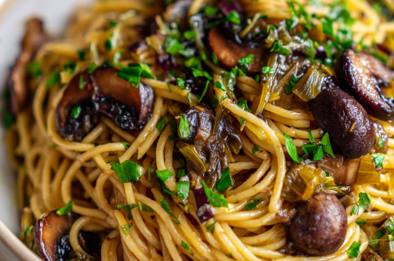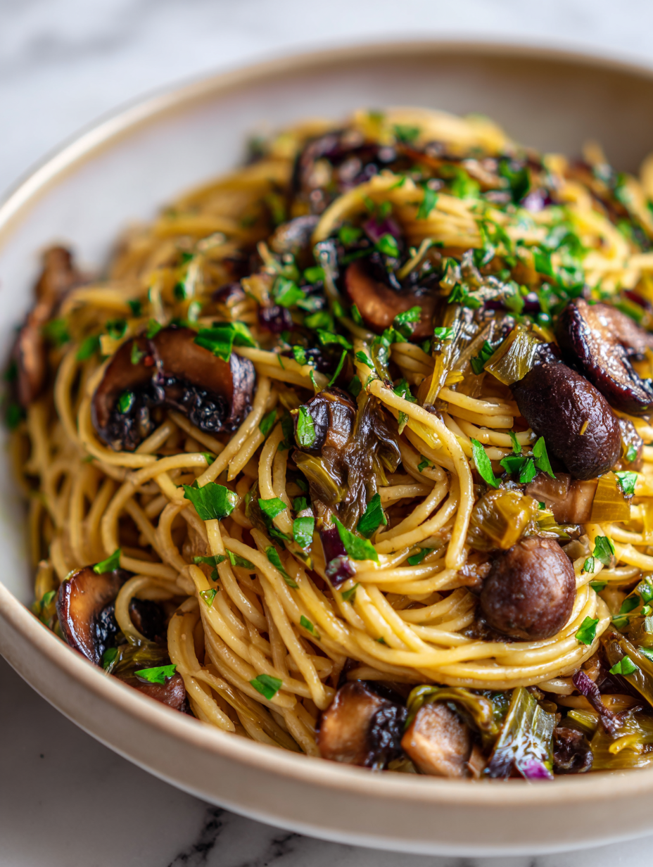 This leek and mushroom pasta features slow, honest caramelization that brings out deep, savory flavors. Leeks soften and sweeten while mushrooms darken and develop umami richness, creating a hearty dish with a rich, golden appearance. The final texture is tender pasta coated in a smoky, earthy sauce with a hint of brightness from lemon zest.