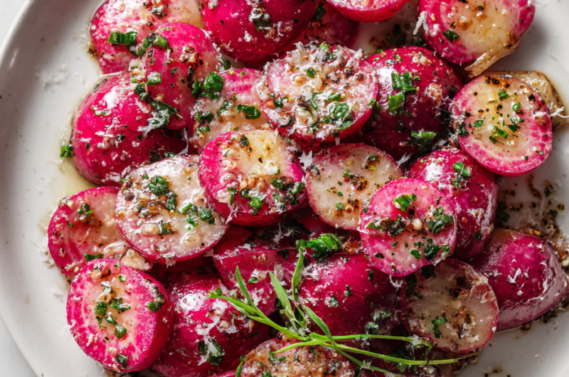 Allow the radishes to rest for 2 minutes to let flavors settle. Finish with a drizzle of olive oil and, if desired, fresh herbs. Serve warm, making sure the Parmesan is crispy and aromatic.