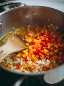 3. Add chopped bell peppers and a teaspoon of smoked paprika, stirring to combine. Cook for about 5 minutes, until the peppers soften slightly and the mixture turns vibrant.