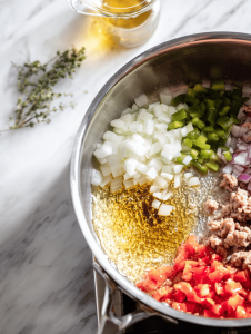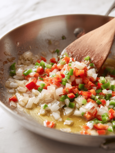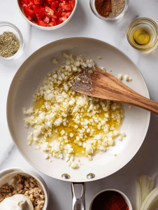 • Chopped onions & garlic: Base aromas that sweeten as they cook, building depth.