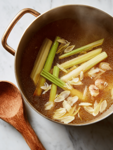 4. Pour in water or chicken broth to cover the ingredients, then bring the mixture to a gentle simmer. Skim off any foam that rises to keep the broth clear and pure.