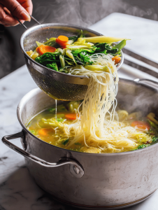 9. Serve the hot soup in bowls, ensuring each has a good mix of vegetables, noodles, and chicken. Enjoy the comforting aroma and wholesome flavors!