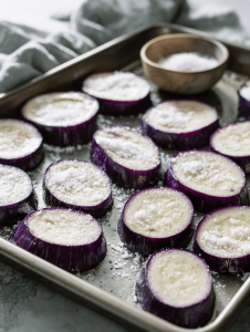 2. Slice the eggplants into 1/2 inch thick rounds, then sprinkle generously with salt and let sit for 20 minutes to draw out excess moisture and bitterness.