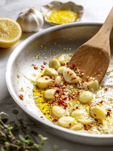 3. Heat the olive oil in a deep skillet over medium heat until it shimmers and begins to gently bubble. Add the minced garlic and sauté for about 30 seconds until fragrant, being careful not to brown it.