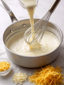 Step 4: Slowly pour in milk, whisking constantly to avoid lumps, and cook until the sauce thickens, around 5 minutes.