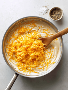 Step 5: Stir in sharp cheddar, melting it down into the creamy base. Add a splash of hot sauce for a smoky kick.