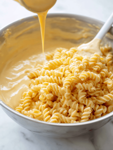 6. Add the cooked pasta to the cheese sauce, folding gently with a spatula until evenly coated and creamy.