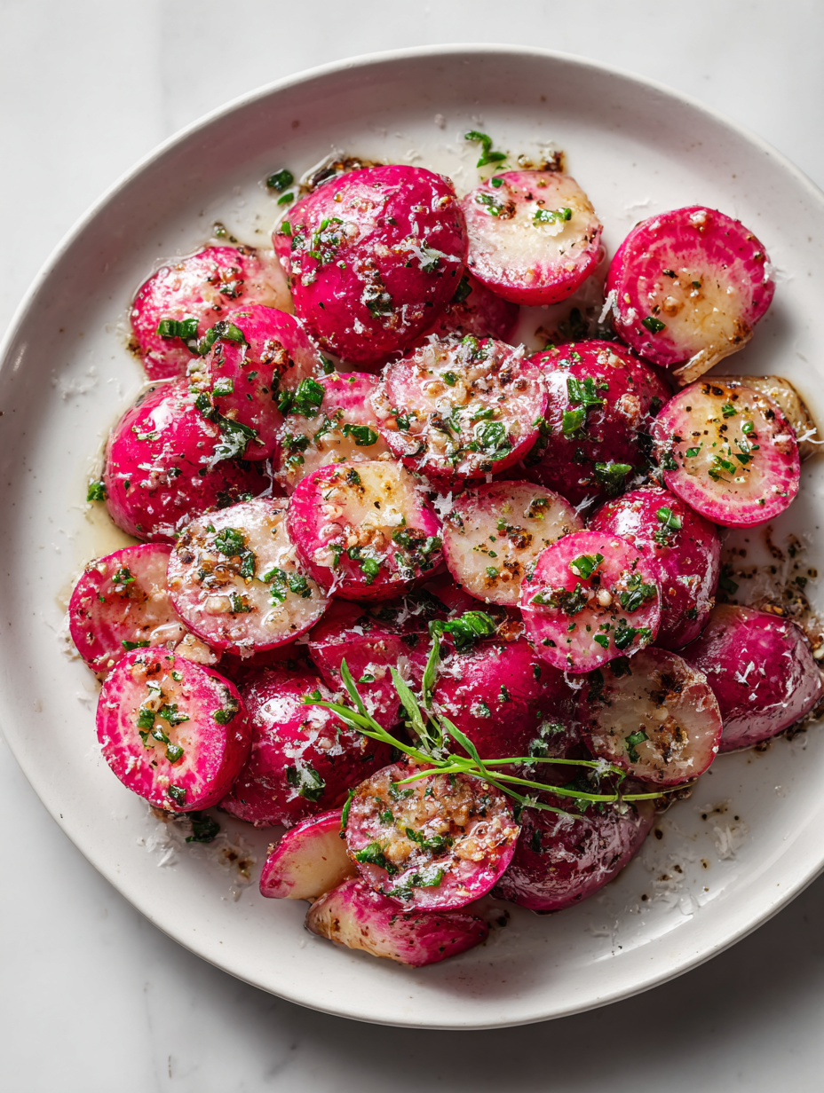 Allow the radishes to rest for 2 minutes to let flavors settle. Finish with a drizzle of olive oil and, if desired, fresh herbs. Serve warm, making sure the Parmesan is crispy and aromatic.